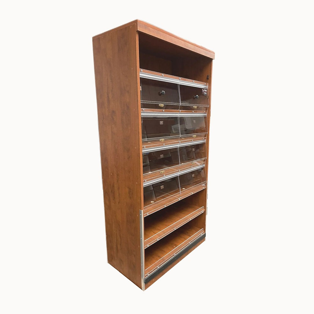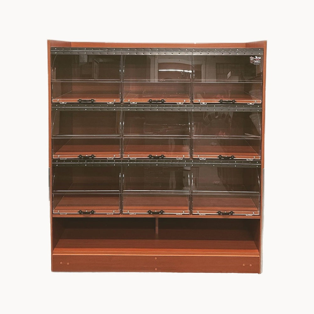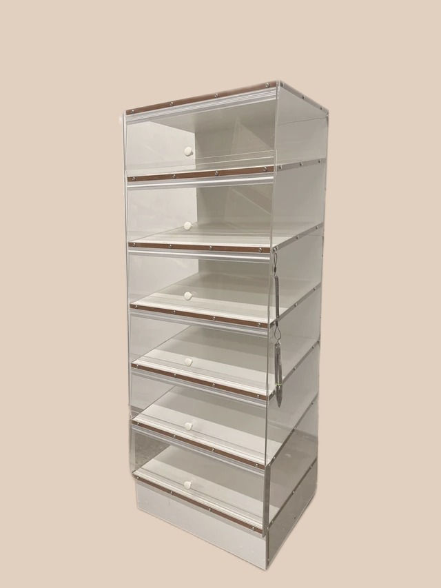 Large Rack with 9-cabinet drawers. Easy pull mechanism that uses acrylic door to seal properly.