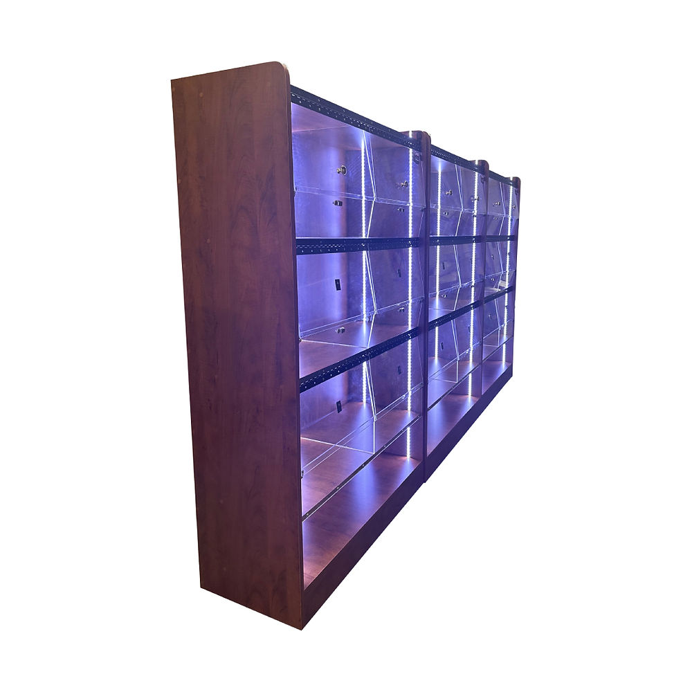 A Rack that has you covered all three sides, 8 feet high. LED lights, with acrylic dividers.