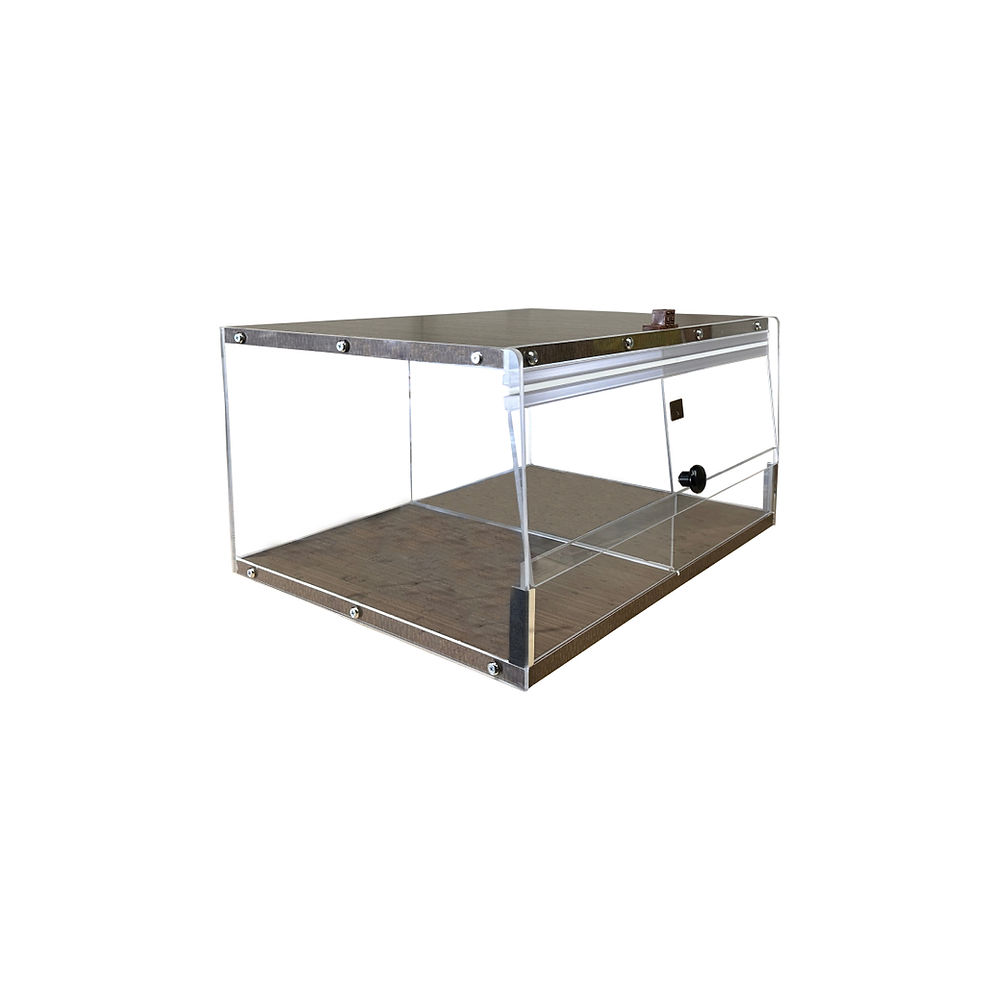 Box size cabinet with a wood roof/base. Acrylic door with mushroom knob with magnetic catcher.